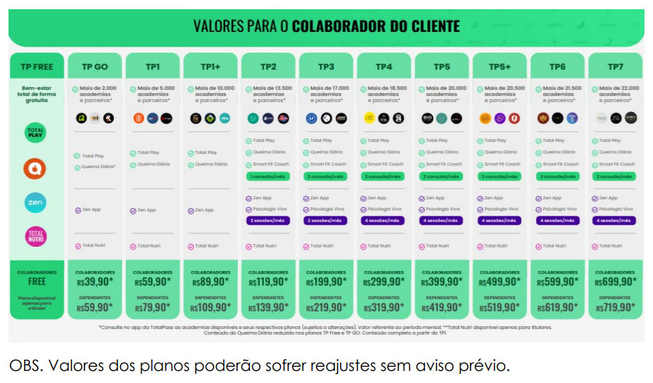 - TotalPass Familiar (01 Titular + 03 dependentes): R$ 15,99 (mensal)